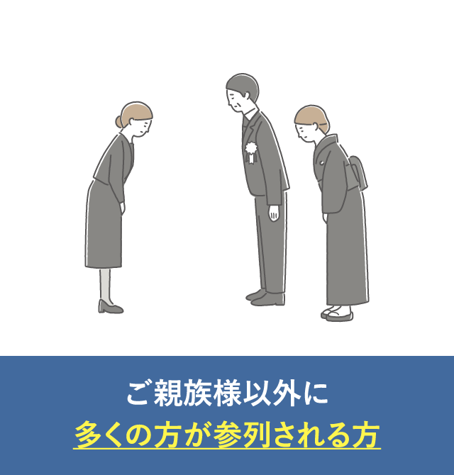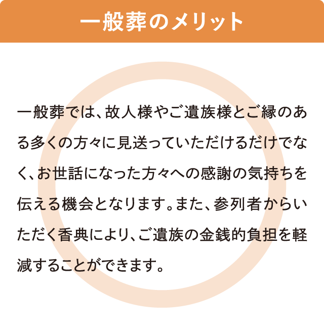 一般葬は、ご家族様や故人様とご縁のあった方々(会社関係など)に広く訃報を知らせ、多くの方々と共に故人を見送る葬儀スタイルです。宗教儀礼に則り、通夜と葬儀(告別式)を2日間にわたって執り行う形式です。