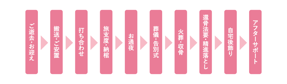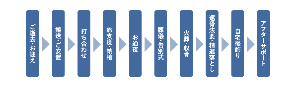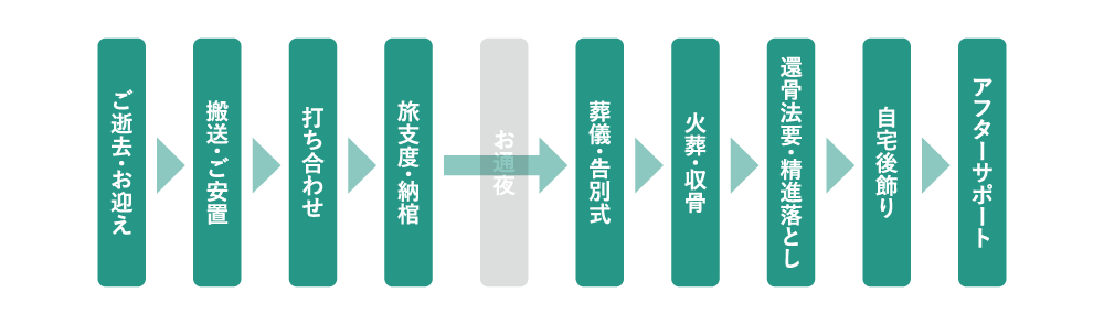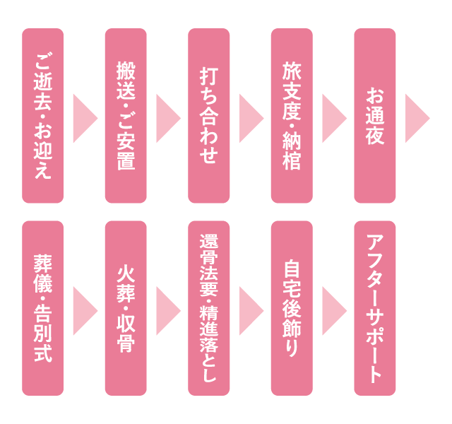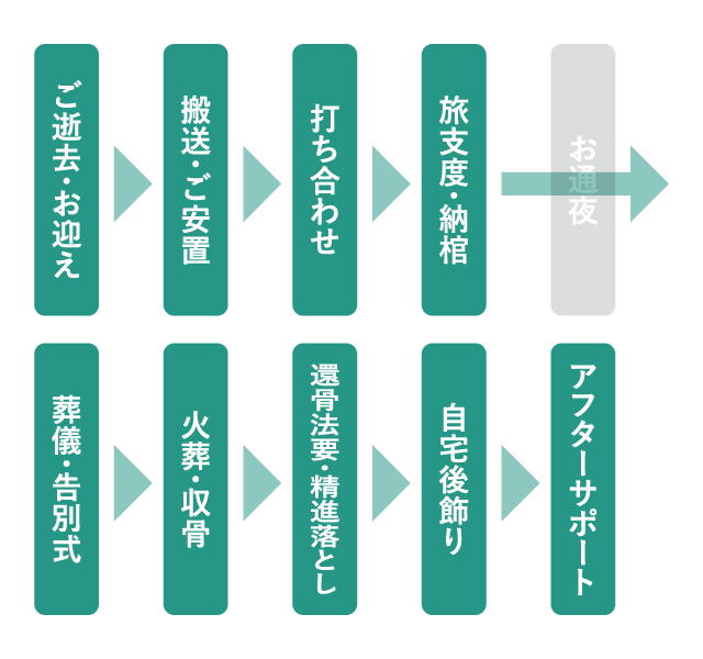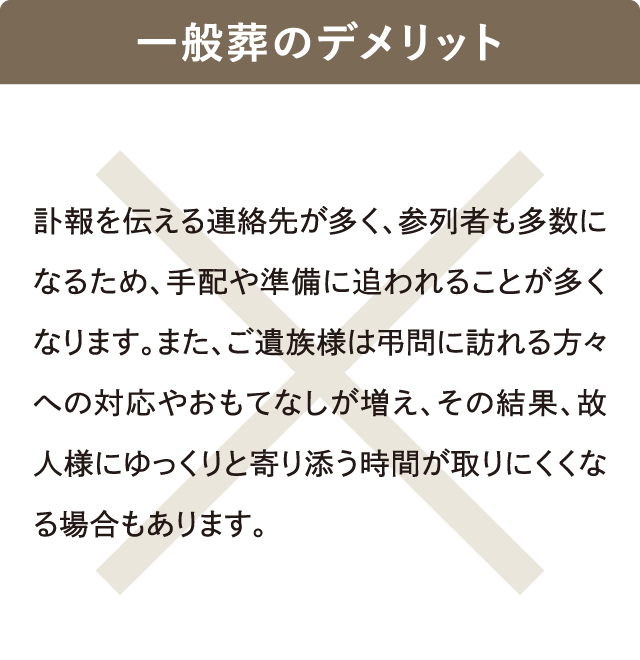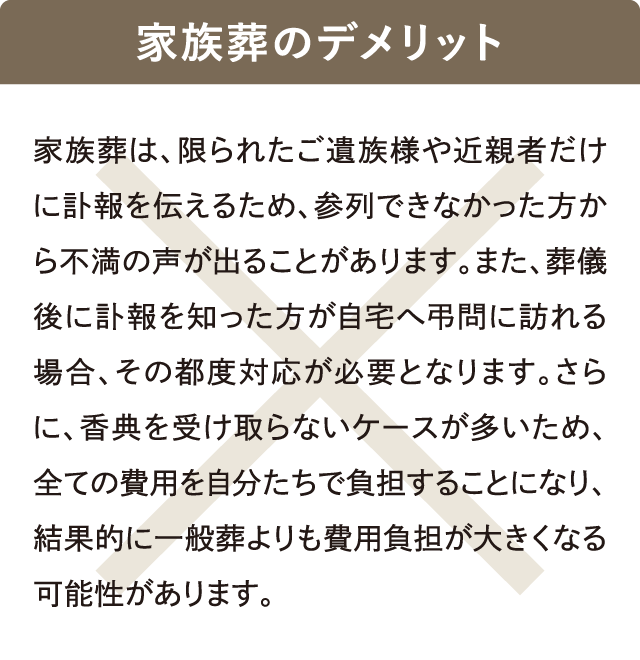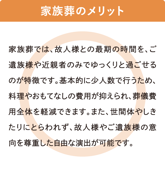 家族葬は、限られた方々のみに訃報を伝え、ご家族や親族を中心に、親しい友人や知人、近親者でのお別れを優先した葬儀スタイルです。一般的な葬儀と同様に、通夜と葬儀(告別式)を執り行うことができます。