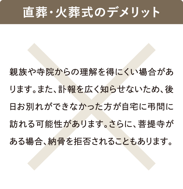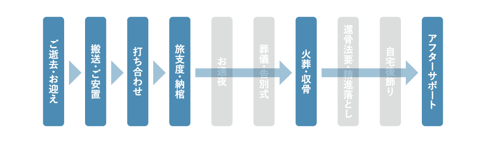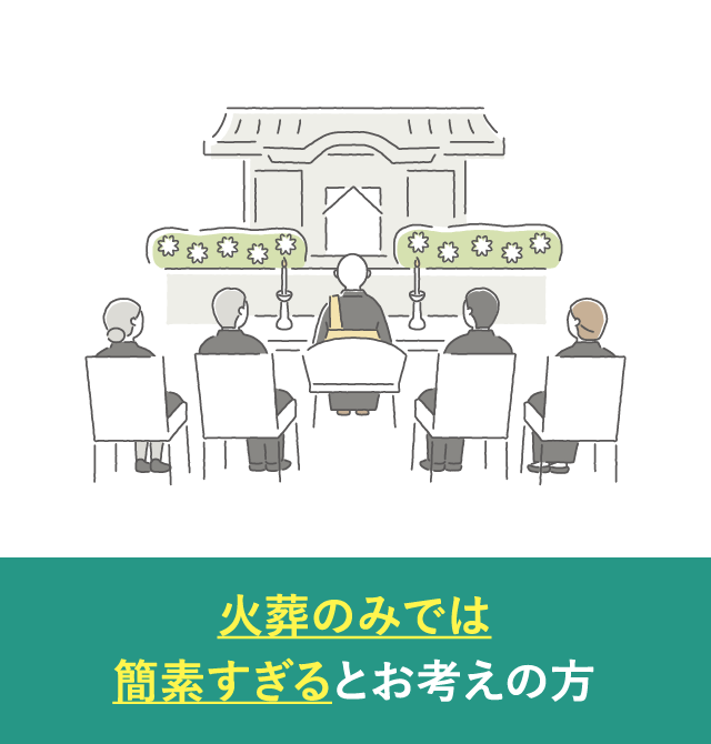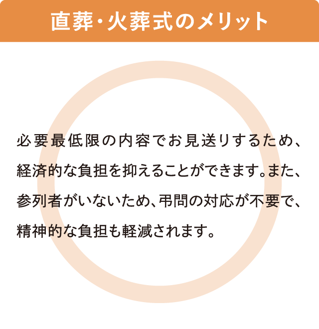 直葬・火葬式は、通夜や葬儀といった宗教儀礼を省略し、必要最低限の内容で行います。限られたご家族やご親族数名でお別れをした後、火葬のみを行うシンプルな葬儀スタイルです。