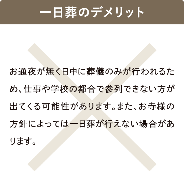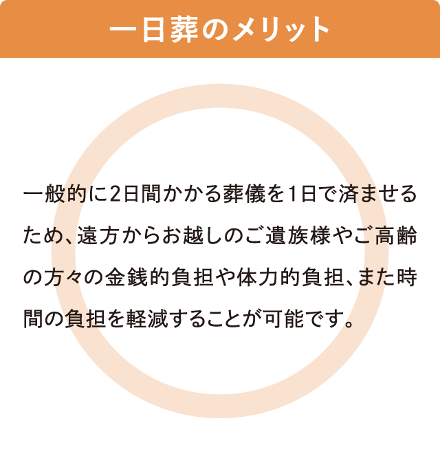 一日葬とは、お通夜を行わず、葬儀(告別式)を火葬日の1日にまとめて執り行う葬儀形式です。従来の2日間にわたる葬儀を1日で行うことで、費用を抑えられるだけでなく、時間が短縮されることで身体的な負担も軽減されます。